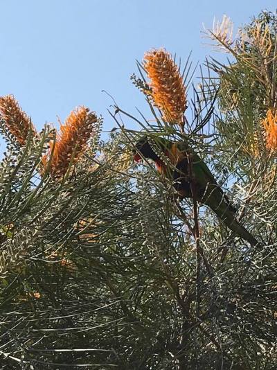 GORGEOUS day. Walking the dogs this morning was very social, loads of stopping and chatting. Saw a little crew of Rainbow Lorikeets feasting on the newly opened Grevillea Tree flowers.
