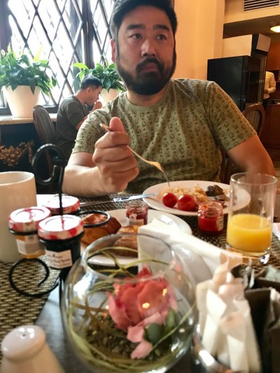 I know Jin looks disgruntled but this is his sleepy morning face. We are enjoying the lavish breakfast the Hilton puts on. It was WAY yummier than the picture gives credit for.