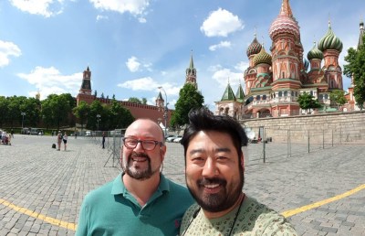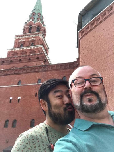 More kissing in front of iconic Russian sites, this time St. Basil’s Cathedral