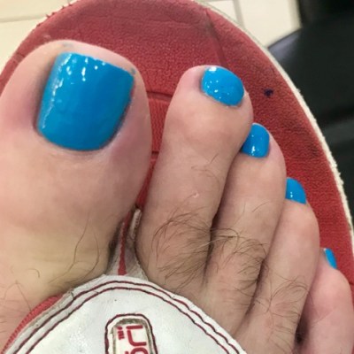 PEDI DAY! I went with aqua blue, it looks like car duco from the early 1980s. YES, I know I have hairy Hobbit feet.
