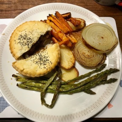 Jin got home around 6pm. He wanted meat pies for dinner and did roast veggies to go with. SO FREAKING DELICIOUS! So I’m calling this a Jin Style Roast Dinner. It’s BASICALLY Beef Wellington, right?