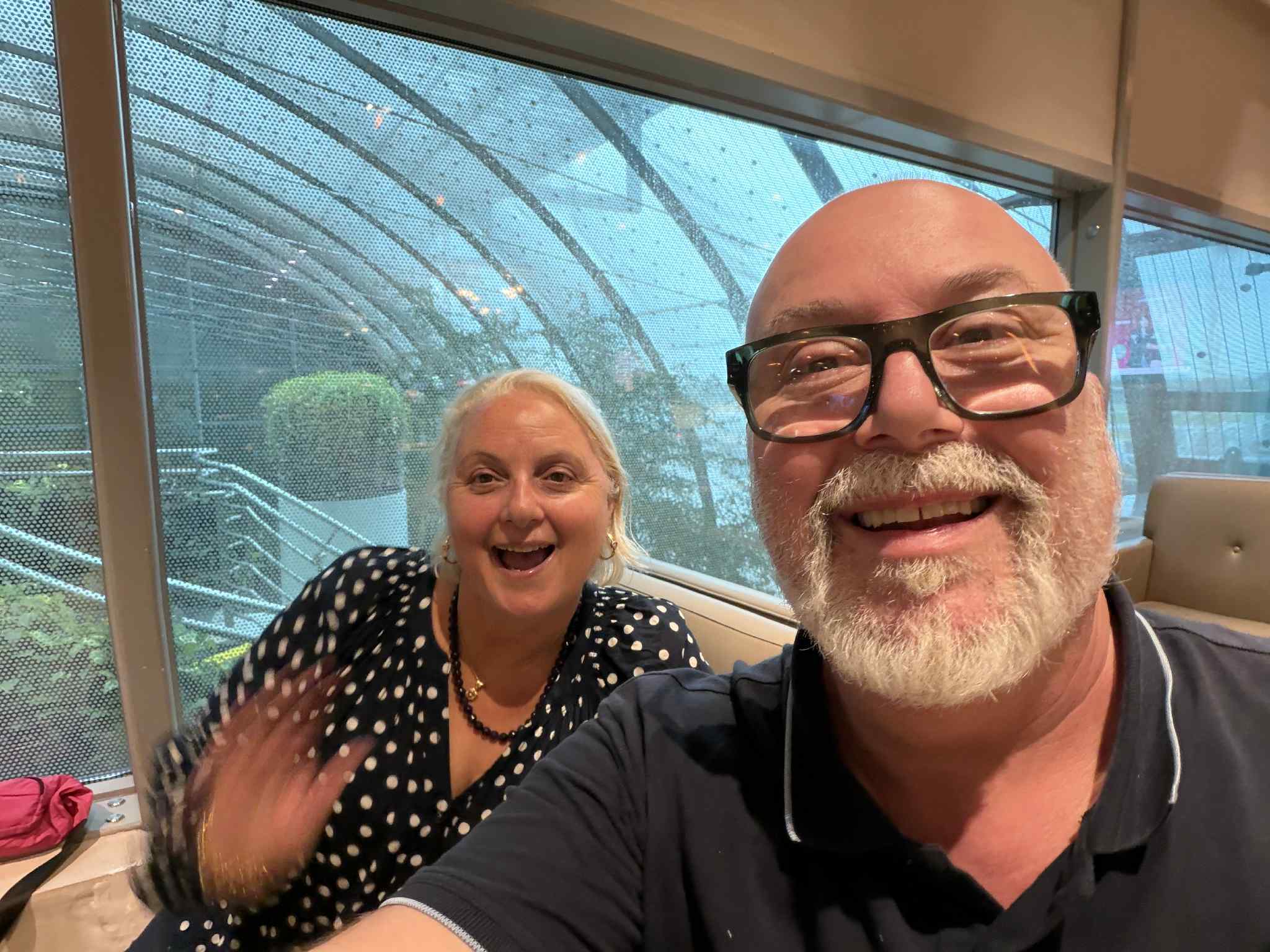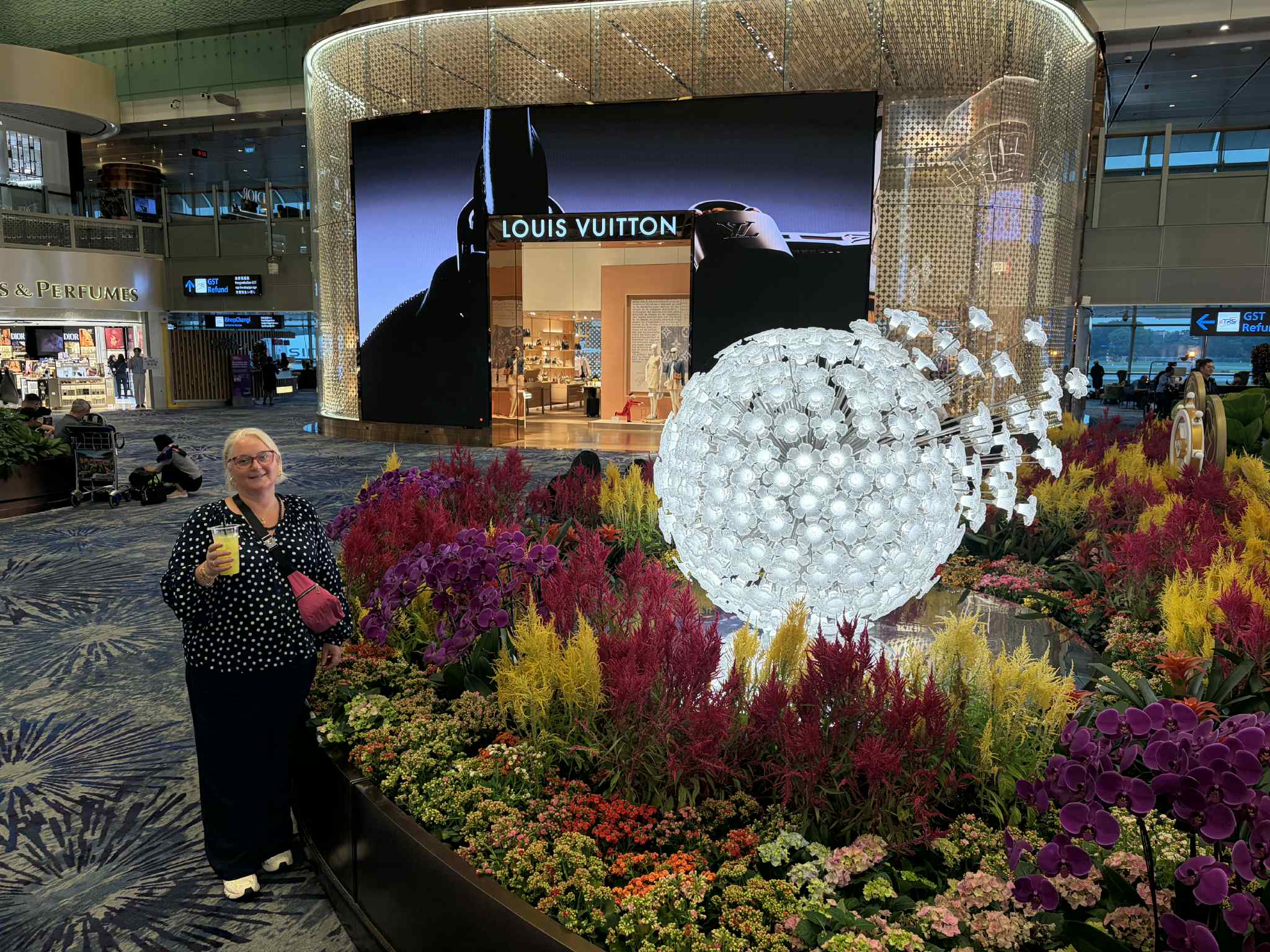 Arrived Singapore Changi Airport. Headed straight for the inter-terminal train to get glimpses of the super grand waterfall, hit the Butterfly Garden and then the Lounge. Jin wanted some very specific foods so he and I ran off to get him fed. We also LOVE to wander airports, even ones we have been to many times. Anna Maria and Johnny were happily ensconced in the Lounge, had showers, ate, relaxed.