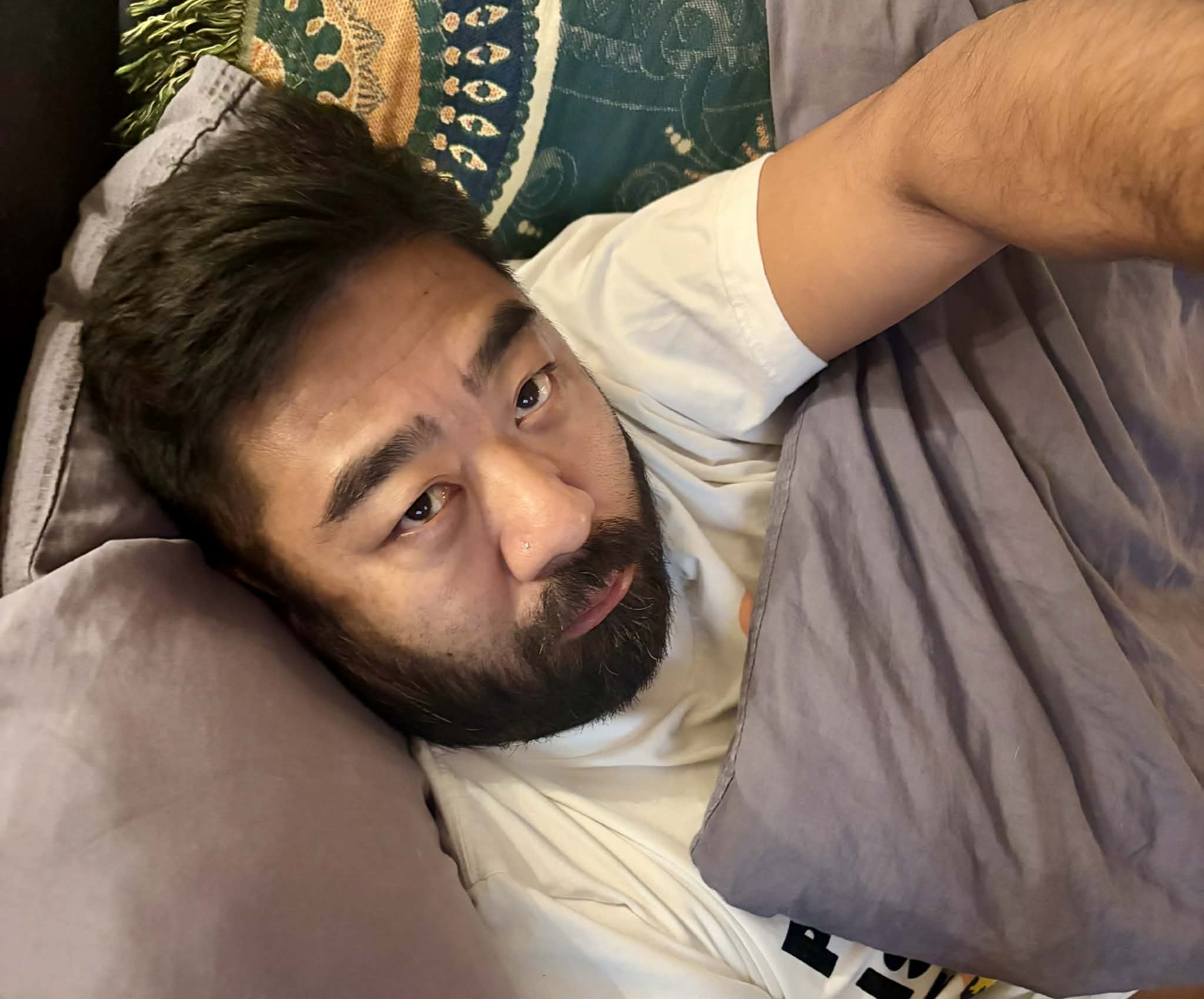 Jin in bed. He needs to get a longer hose attachment for the cooktop tomorrow.