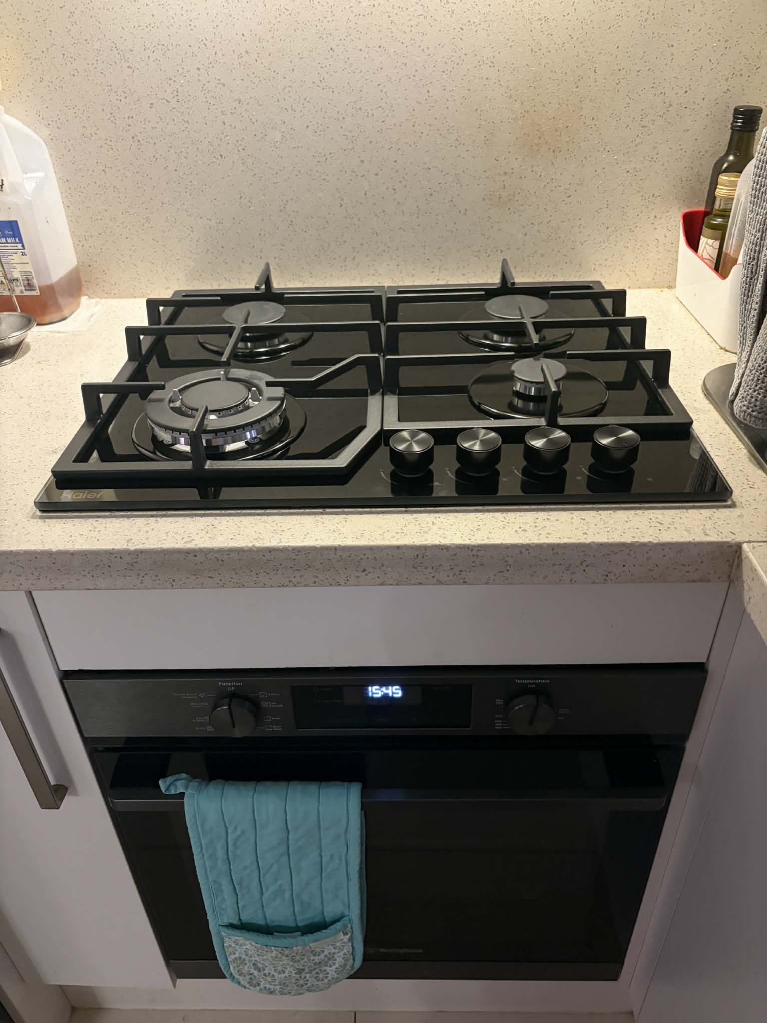 Jin is fed up with our gas cooktop. It’s not starting properly on his favourite burner and he can’t work out how to get it going again. This afternoon, through his sickness he’s decided we need to get a new one. So off we go and purchase a brand new, glass baseplate gas stove for the benchtop. It’s really gorgeous and now matches our black oven.