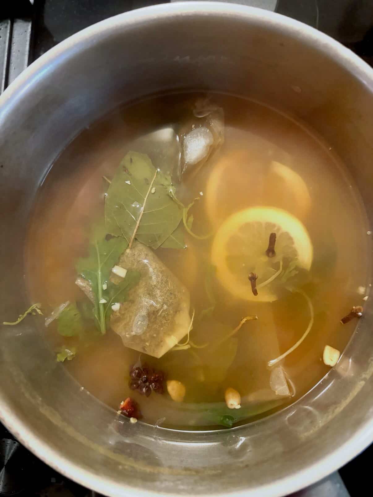 clove, cinnamon, cracked cardamom pods, bay, parsley, clove, star anise and cracked pepper.